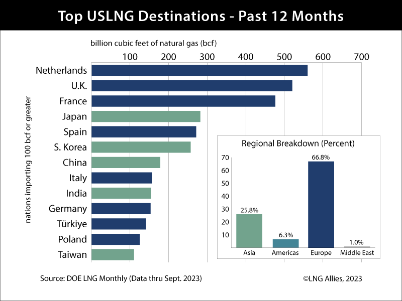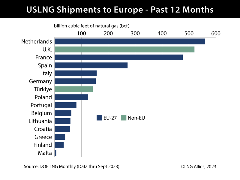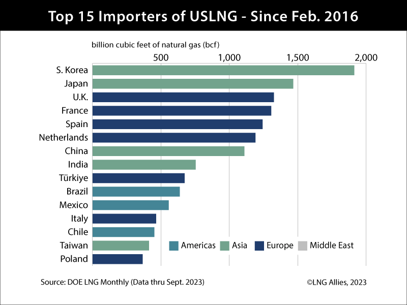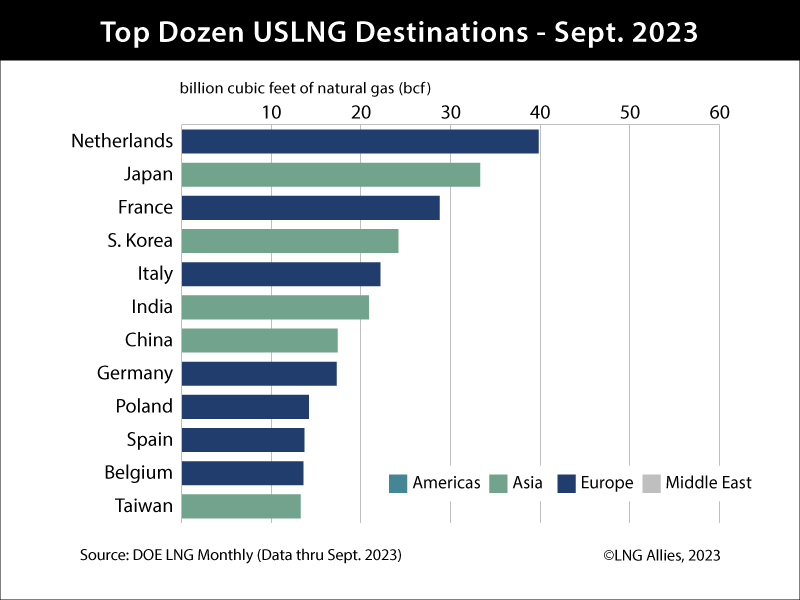 • Top five countries of destination, representing 42.2% of total U.S. LNG exports in September 2023: Netherlands (39.7 bcf), Japan (33.2 bcf), France (28.7 bcf), South Korea (24.1 bcf), and Italy (22.1 bcf).