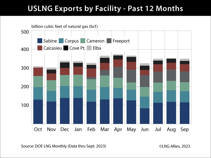 • 107 cargos shipped in September 2023: Sabine Pass (33), Cameron* (28), Freeport (18), Corpus Christi (17), Elba (6), and Cove Point (5).